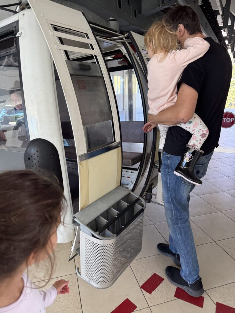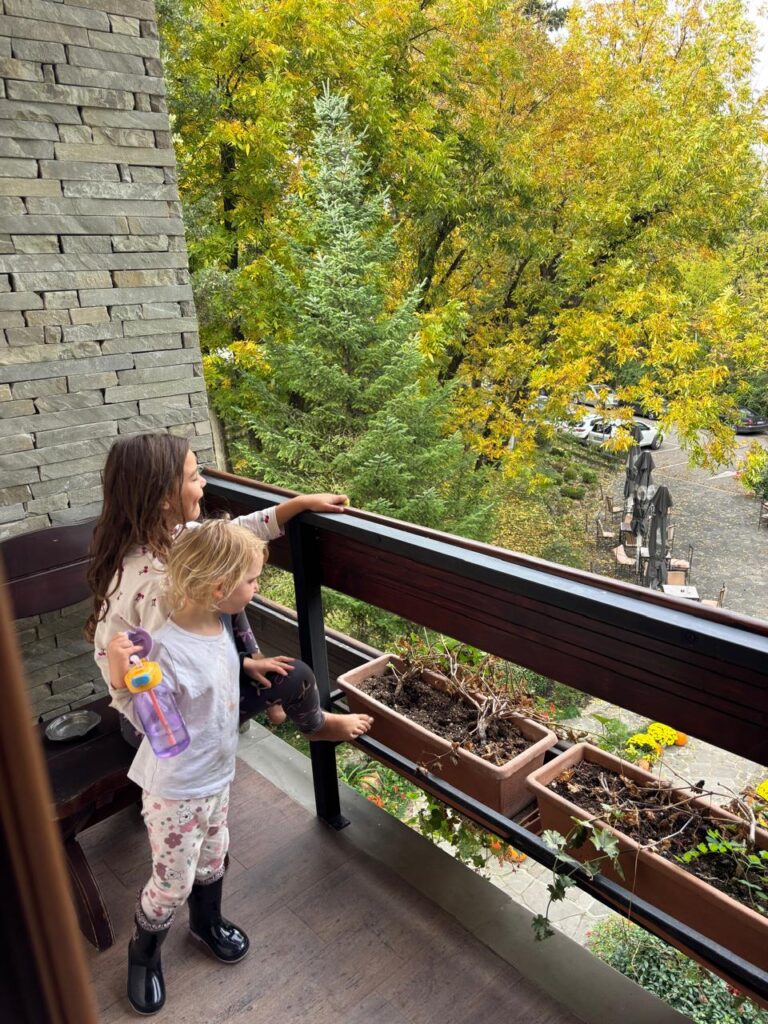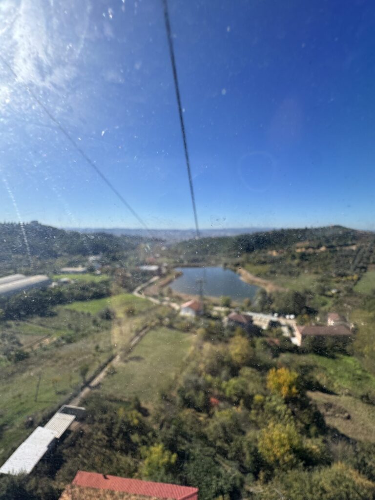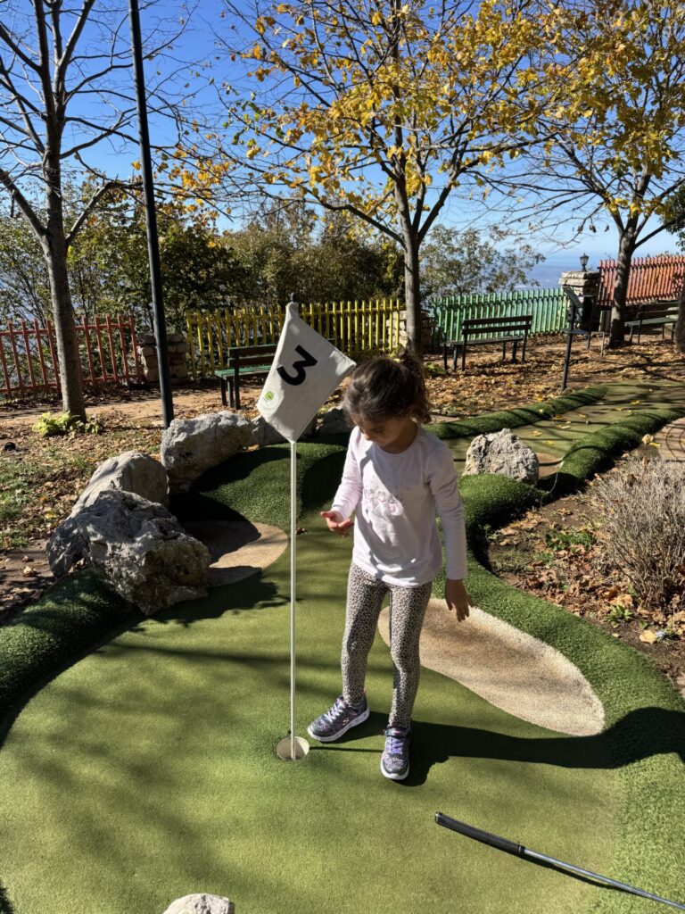The views are spectacular, the city, lakes, and autumn colors made it magical. At the top, there’s a whole adventure area with a ropes park, mini-golf (Maya loved it!), horseback riding, paragliding, paintball, and more. There’s also a hotel with a bar on the 7th floor, lookout points, and a restaurant with an amazing view and delicious food.