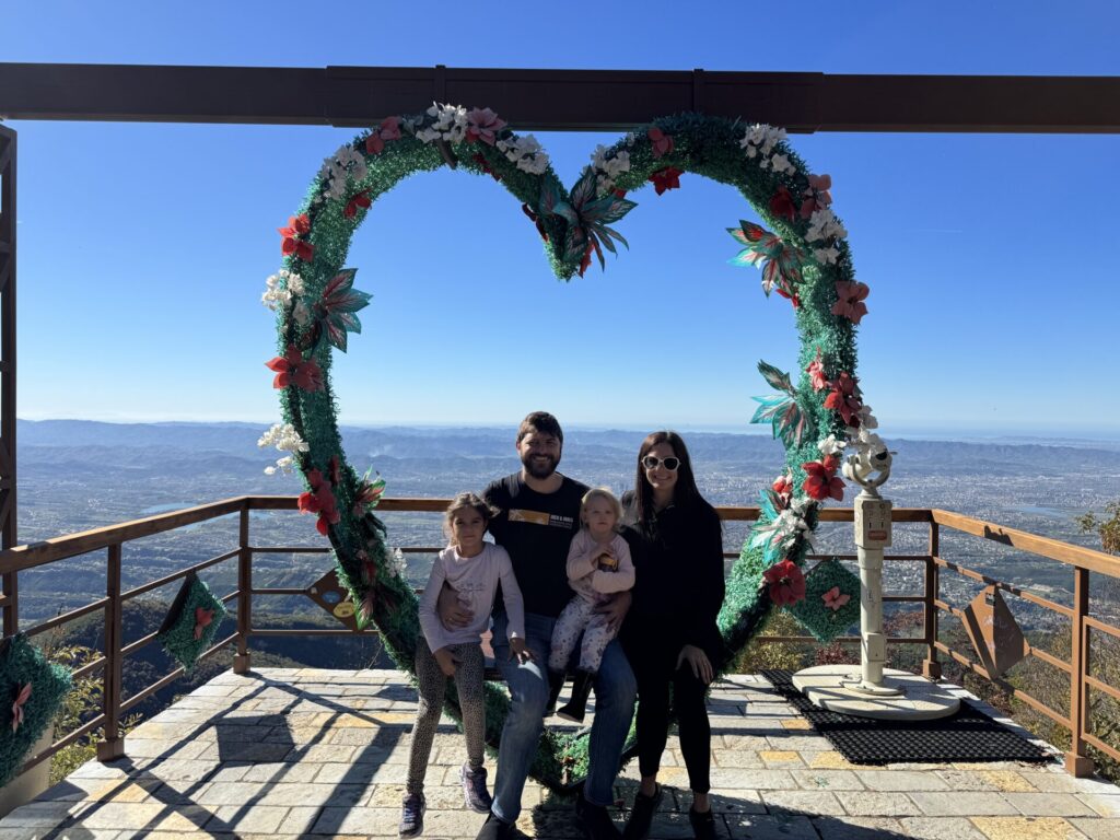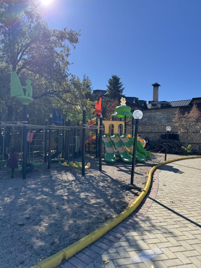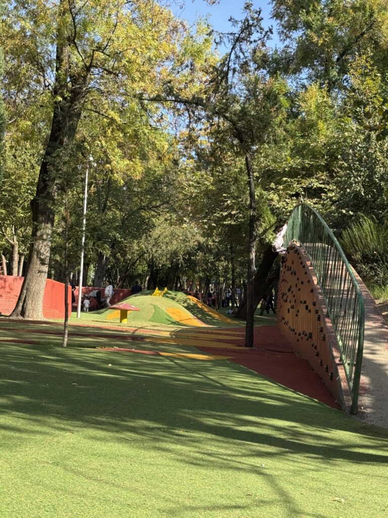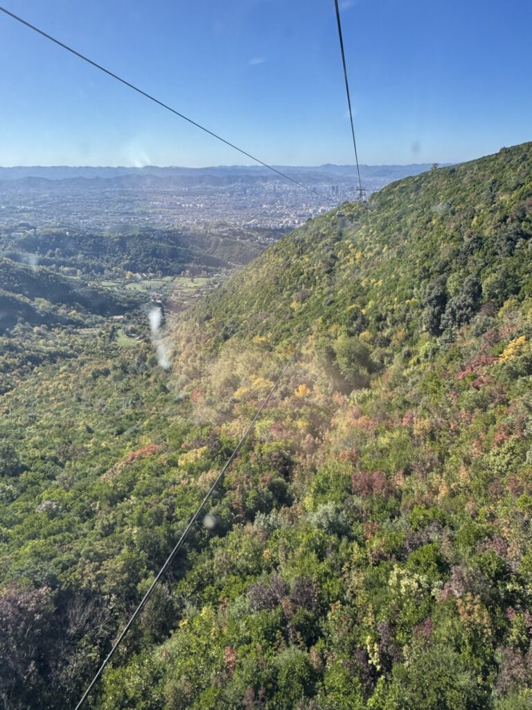 The views are spectacular, the city, lakes, and autumn colors made it magical. At the top, there’s a whole adventure area with a ropes park, mini-golf (Maya loved it!), horseback riding, paragliding, paintball, and more. There’s also a hotel with a bar on the 7th floor, lookout points, and a restaurant with an amazing view and delicious food.