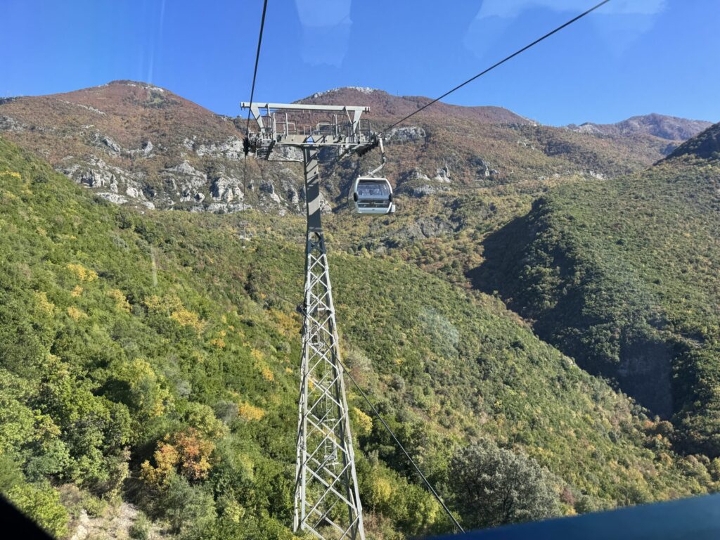 Tip: As soon as you arrive at the top, reserve a table by the window at the Dajti Balcony’s restaurant, it fills up fast. Next to it, there’s a lovely photo spot with a heart sculpture and a bench overlooking the mountains.
