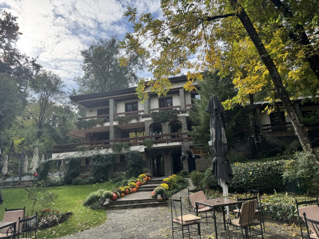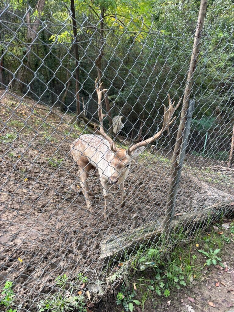 This hotel is inside a park, though Google Maps directions can be confusing, use these coordinates: [directions]. Paid parking costs €1 during the day. The hotel is peaceful and charming, with lawns, a playground, and even a deer enclosure. Rooms are basic but spacious and comfortable, and we booked two side-by-side rooms (€70 per room per night, breakfast included). Each room had a balcony overlooking the park. There’s no elevator, only stairs.