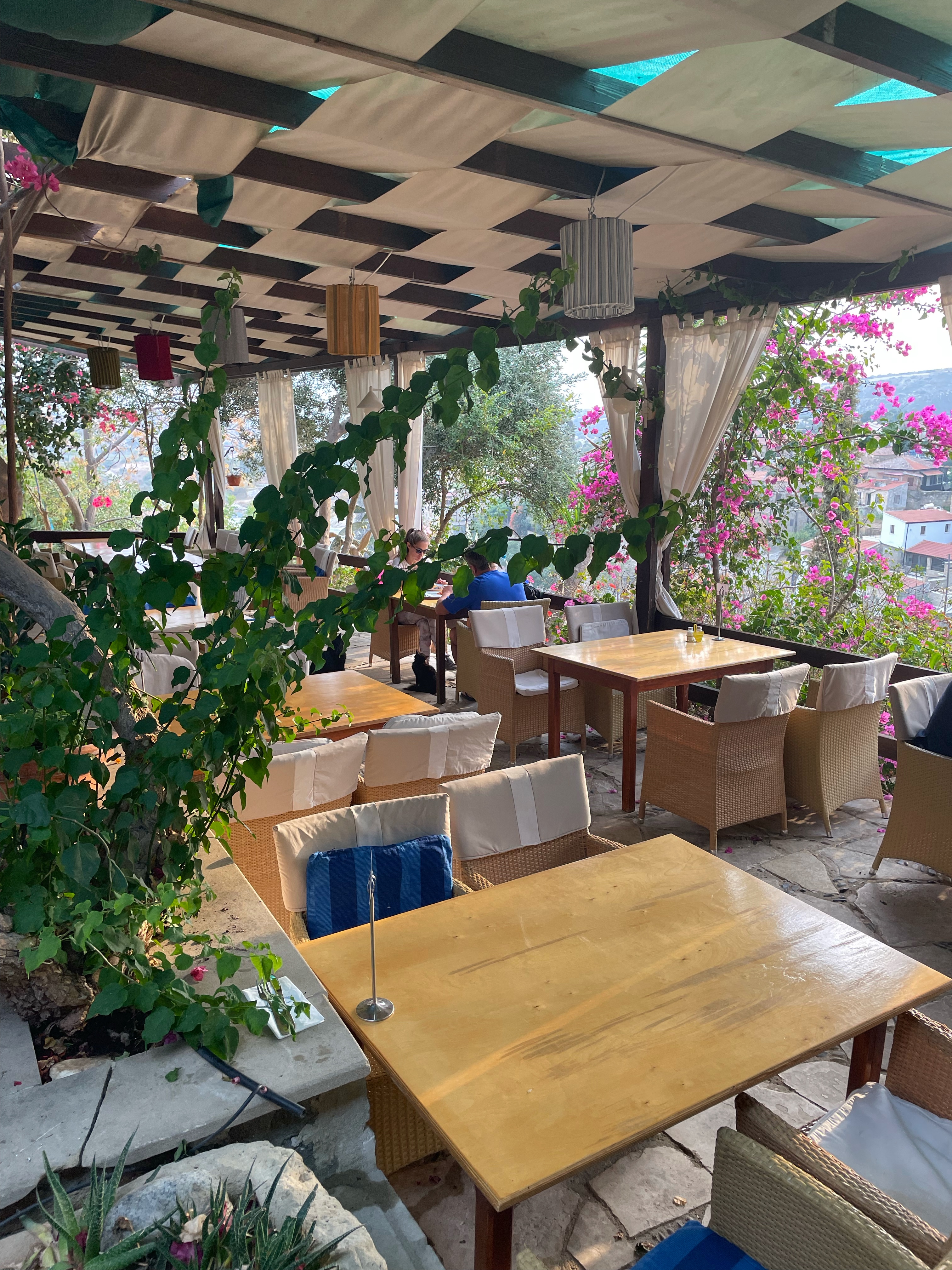 There are 3 taverns in the village and we decided to eat at the George restaurant taverna. We saw good recommendations about the place and we were not disappointed. Sitting outside in the square with trees and in front of the beautiful umbrellas hanging outside.