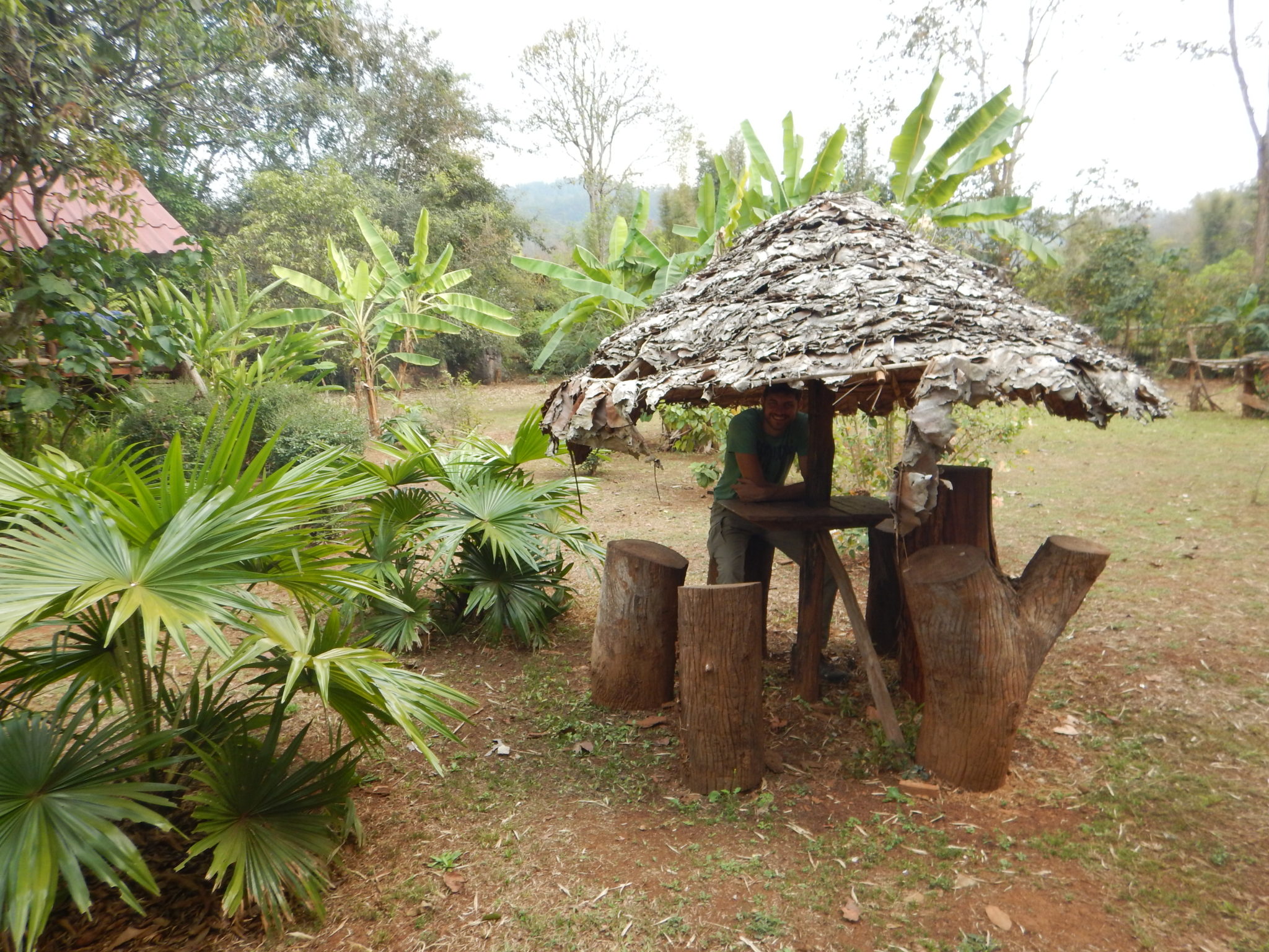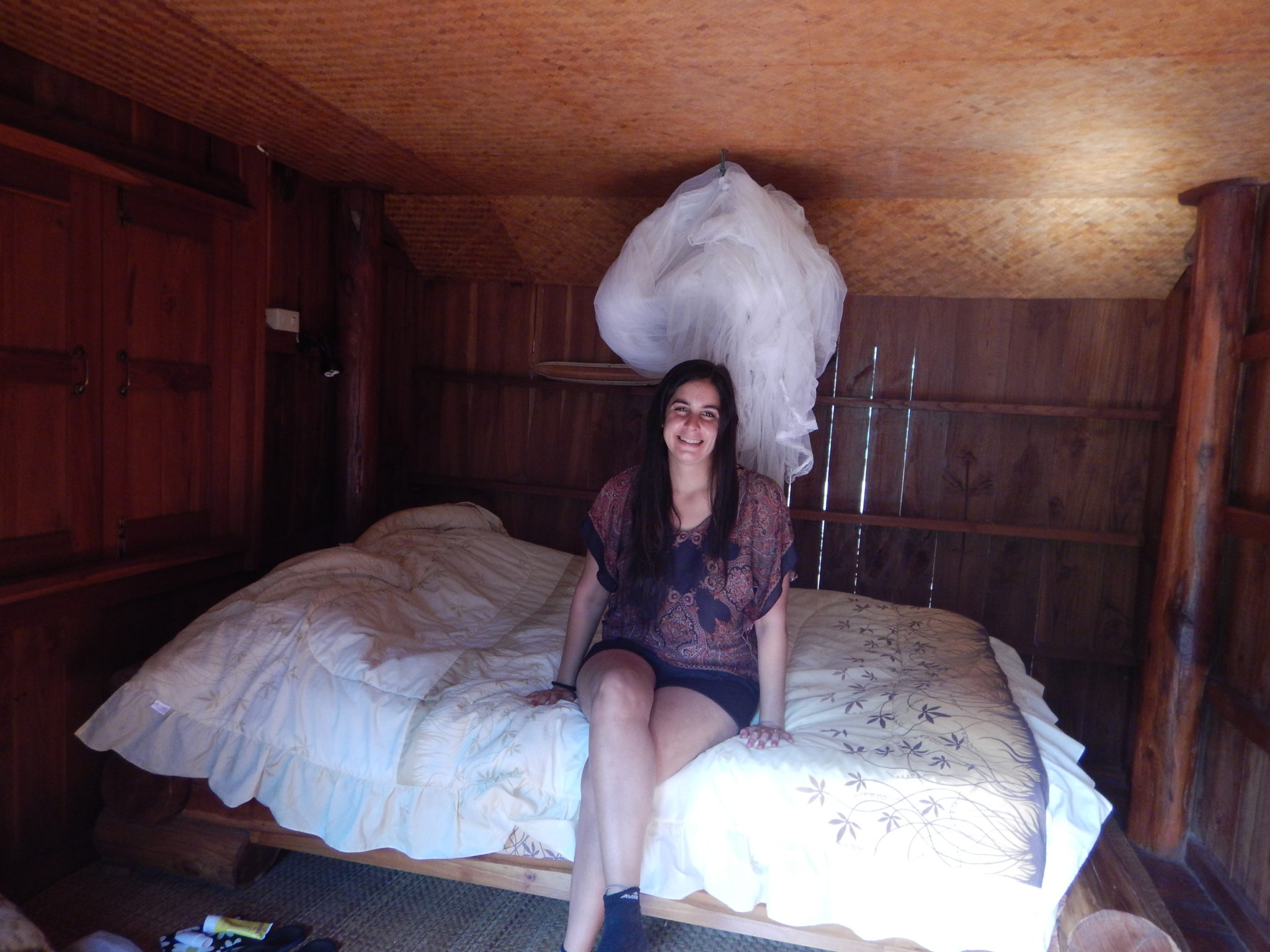 We got to the cave area and we started searching for a place to spend the night. We spotted a large sign that said โPen Cave Homestay.โ We walked inside, and I instantly fell in love. The rooms are cute bungalows with a big bed. There is a large garden with a lot of trees and other plants, and it was such a lovely place. There is also a patio with large tables and a little chill area. The owner said she makes organic food in case we wanted her to cook for us. Obviously we ended up taking the bungalow for 500 Baht per night.
