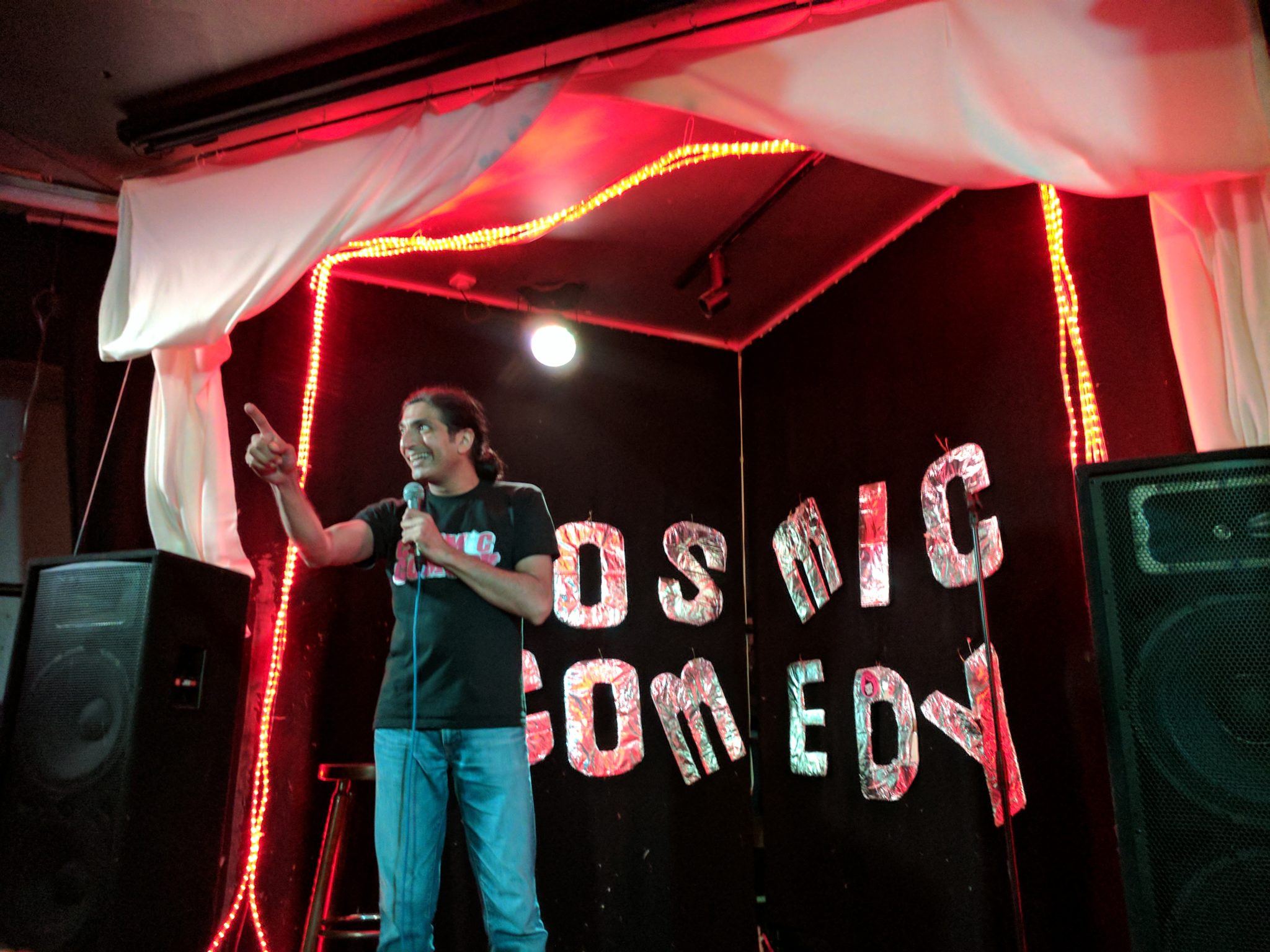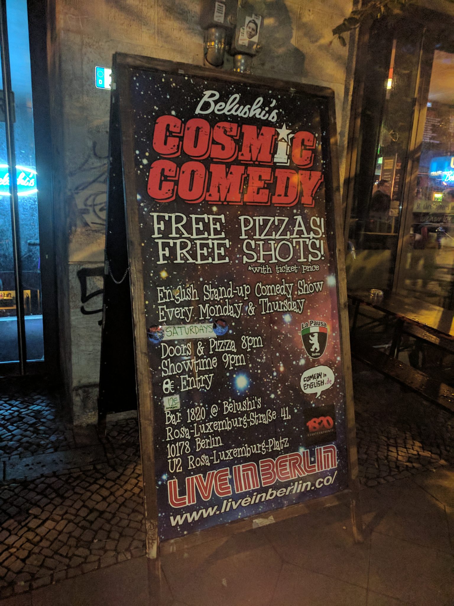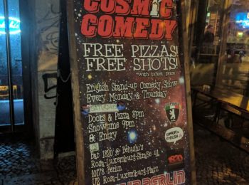 One of my favorite entertainments are standup shows , so when I found an ad about a standup show that cost 18 euro (including pizza) and had great reviews, I knew that I had to go there – Cosmic Comedy show.